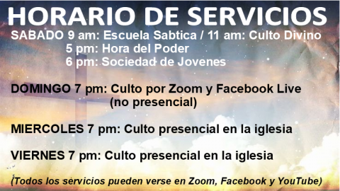 Bienvenidos a la página de la Iglesia Adventista Hispana de Santa Ana, California. Somos una comunidad Cristiana que rinde honor y alabanza a nuestro Dios Creador y nos gustaría que nos visites con tu familia. Acompáñanos a nuestros servicios de estudio de la Palabra de Dios, alabanza y oración. También te invitamos a que explores nuestra página de internet y conozcas más acerca de nuestras creencias.